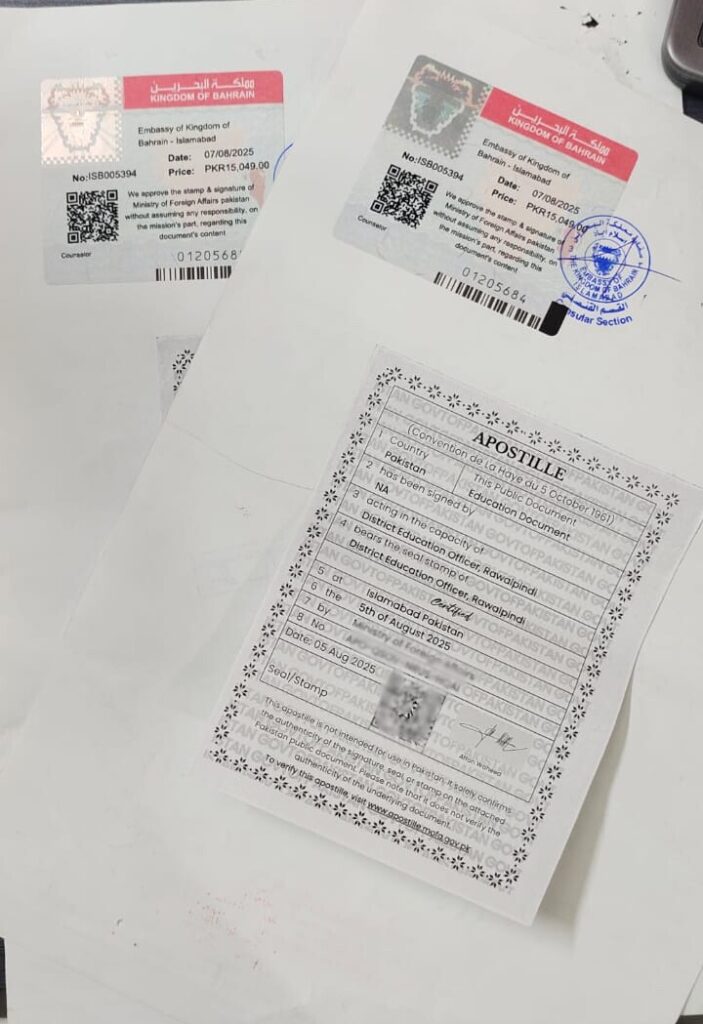Of the degree/document verification/attestation from Bahrain Embassy in Islamabad, with minimal service charges. You can get your document attested at your door step without wasting your time, energy, and additional money which you will spend to come Islamabad. Thus giving you financial and monetary benefits.